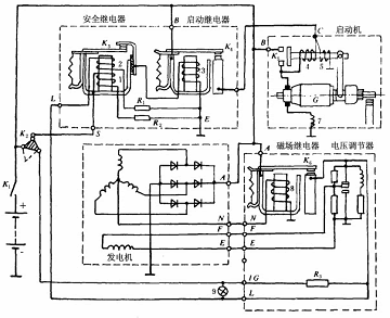 2-安全继电器线圈;3-起动继电器线圈;4-起动机电磁开关吸引线圈;5-起动机电磁开关保持线圈;6-起动机电枢;7-起动机磁场绕组;8-发电机磁场继电器线圈;9-充电指示灯;K1-电源开关;K2-起动开关;K3-安全继电器触点;K4-起动继电器触点;K5-起动机电磁开关触点;K6-磁场继电器触点
