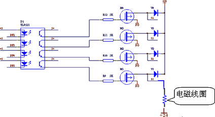 3. 下图所示为一个电磁线圈执行器的驱动电路。试以其中一路为例说明其工作原理(按输入信号是高、低两种电平状态进行说明)。