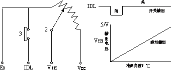 9. 下图所示为节气门开度传感器的电路和电特性图。设节气门开度的全行程范围为30度,Vcc=5V,E2=0V。当VTH=1V时,节气门的开度为度。