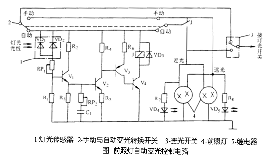 1. 下图所示为某汽车的前照灯自动变光控制电路,试分析其工作原理。