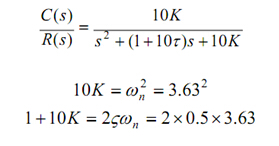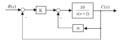四、(14 分)系统方框图如图所示,要求超调量σ% = 16.3%,峰值时间t p = 1秒,求放大器放大倍数K 和反馈校正微分时间常数τ。